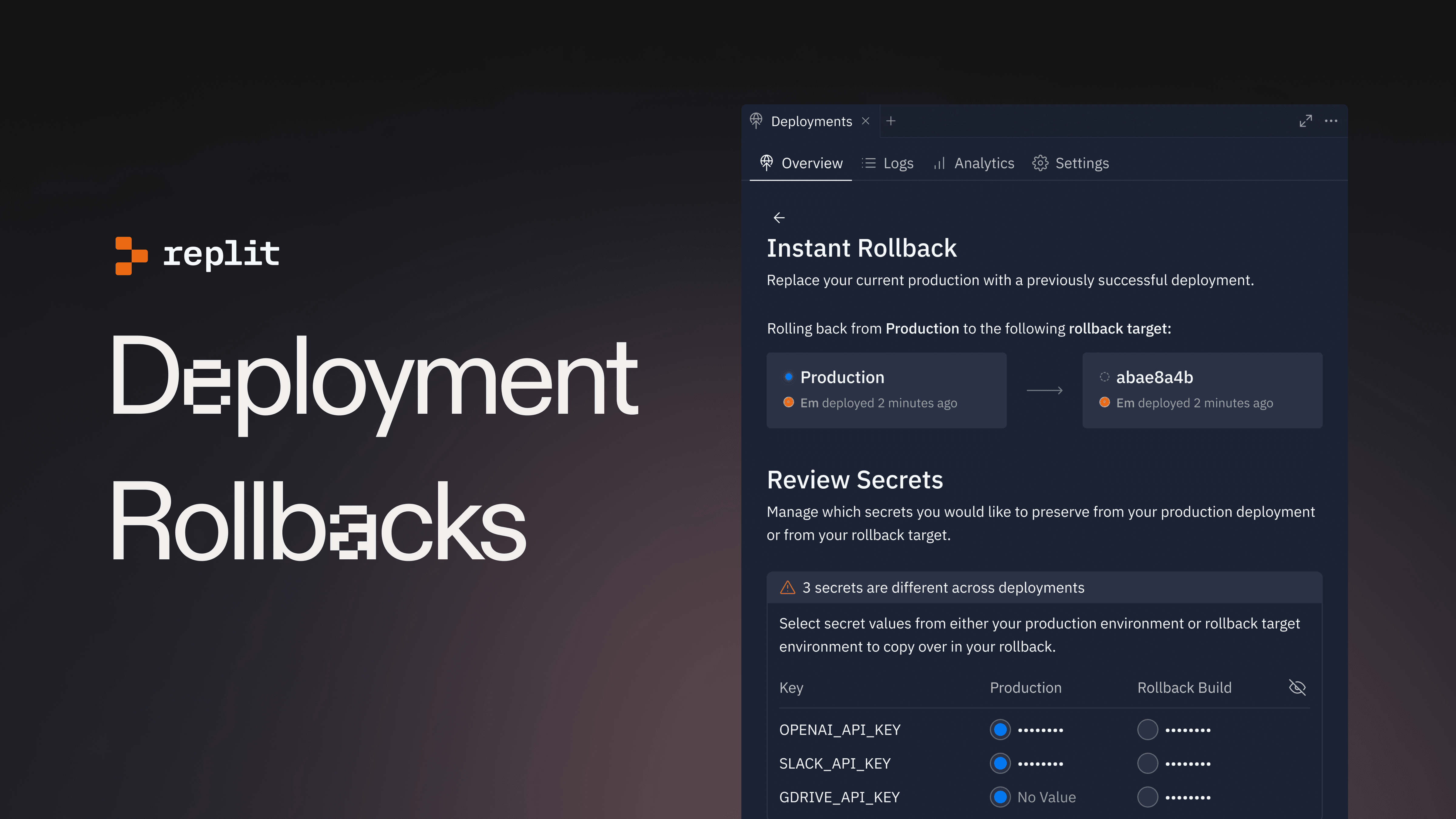В Replit появился откат деплоев: можно вернуть предыдущую успешную версию одним кликом. Удобно, когда сломал билд или затесалась опечатка — минуты на исправление вместо полного редеплоя.