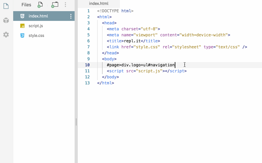 Поддержка действует в любом repl, если вы редактируете файл с расширением .html или .css. Официальная документация Emmet поможет освоить синтаксис и шорткаты.